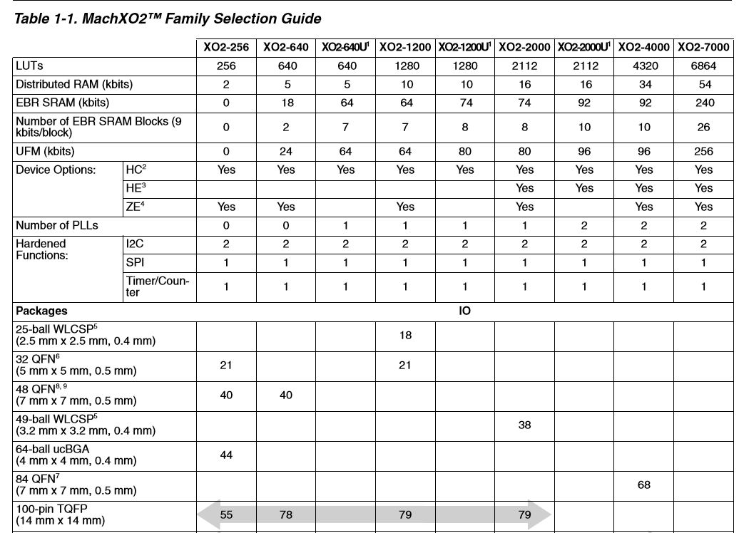 MACHXO2 入门开发板采用Lattice的MACHXO2家族系列芯片,LCMXO2-1200HC或者LCMXO2-2000HC CPLD芯片。MACHXO2系列芯片具有低功耗,瞬时启动,高安全性,低成本,内置SPI/I2C等特点。封装是LQFP100,从640HC到2000HC芯片资源如下表所示。