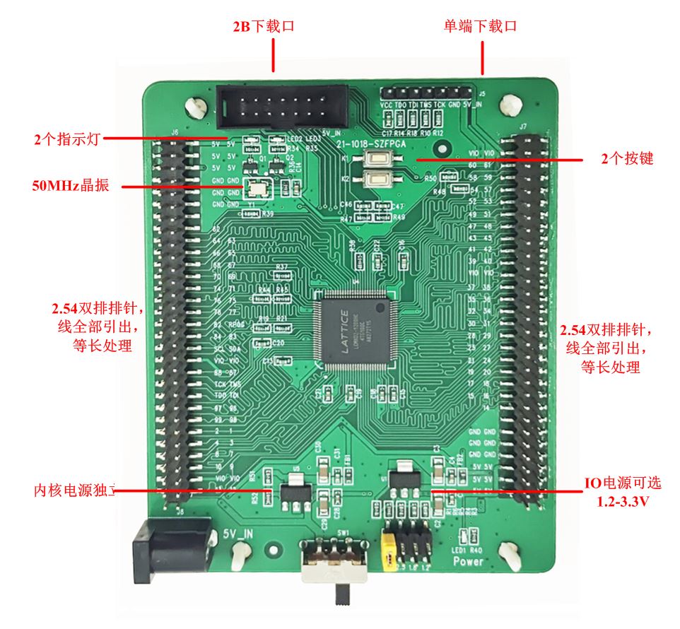 MACHXO2 入门开发板将IO数据线缆已经做了等长处理,VCC和VCCIO电源是独立。VCCIO电源可以选择从1.8到3.3V之间。